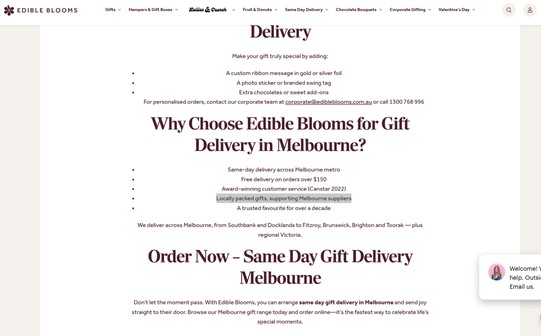Edible Blooms website – Locality + coverage: “locally packed” paired with a clear service area.