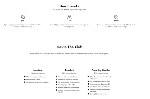 Strong membership pages typically include: a welcome headline, simple explanation, and benefits that feel like access (early drops, priority windows, member-only products/events), not just discounts.